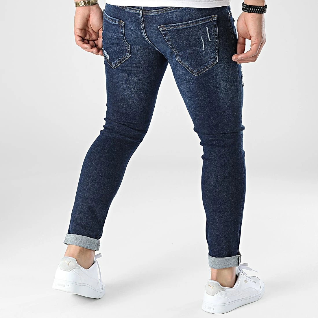 • Jean slim en coton stretch finition délavée et usée avec rapiéçages